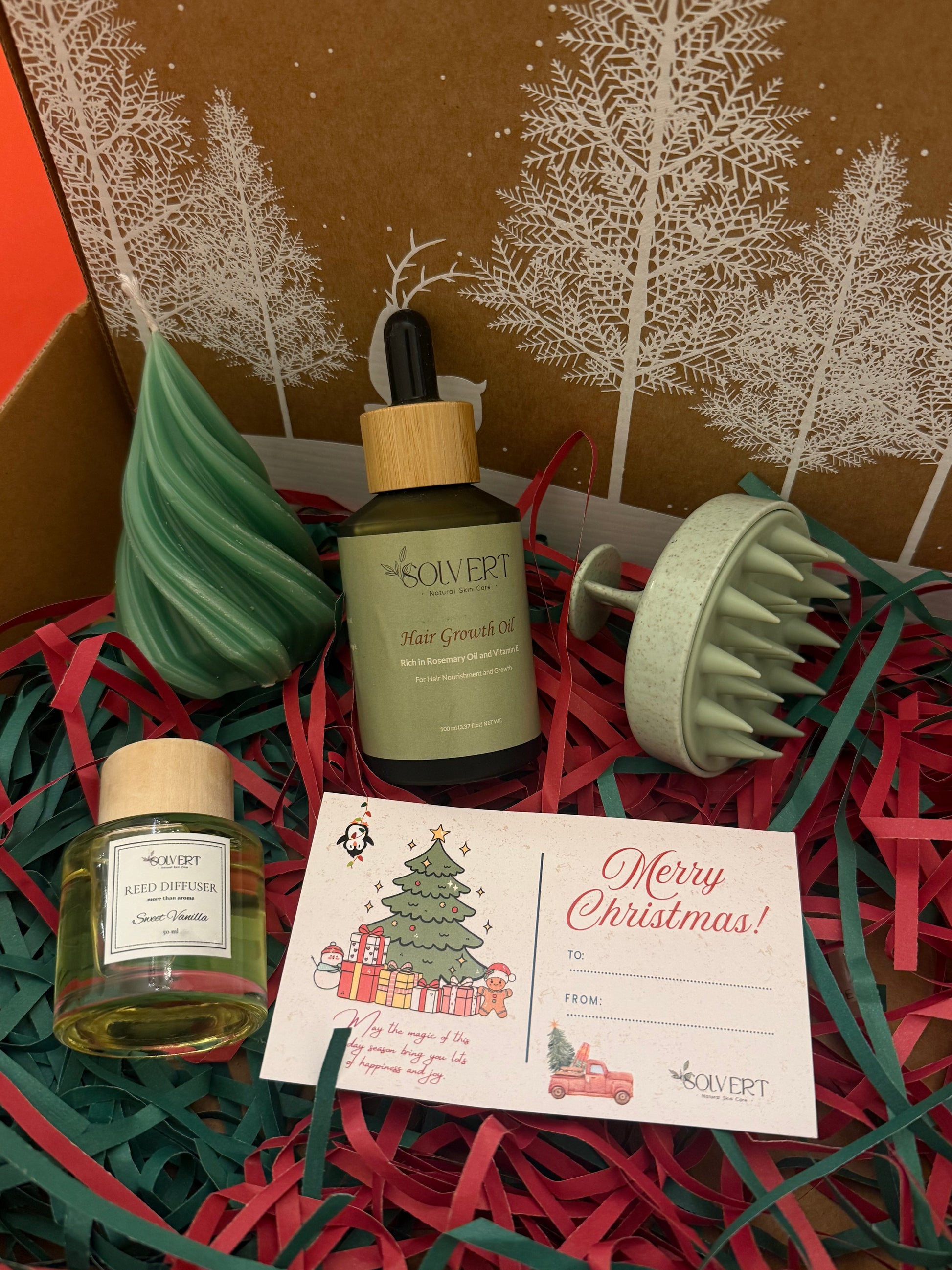 Glow, relax, and unwind with our Christmas bundle: hair oil, reed diffuser, tree candle & scalp massager.